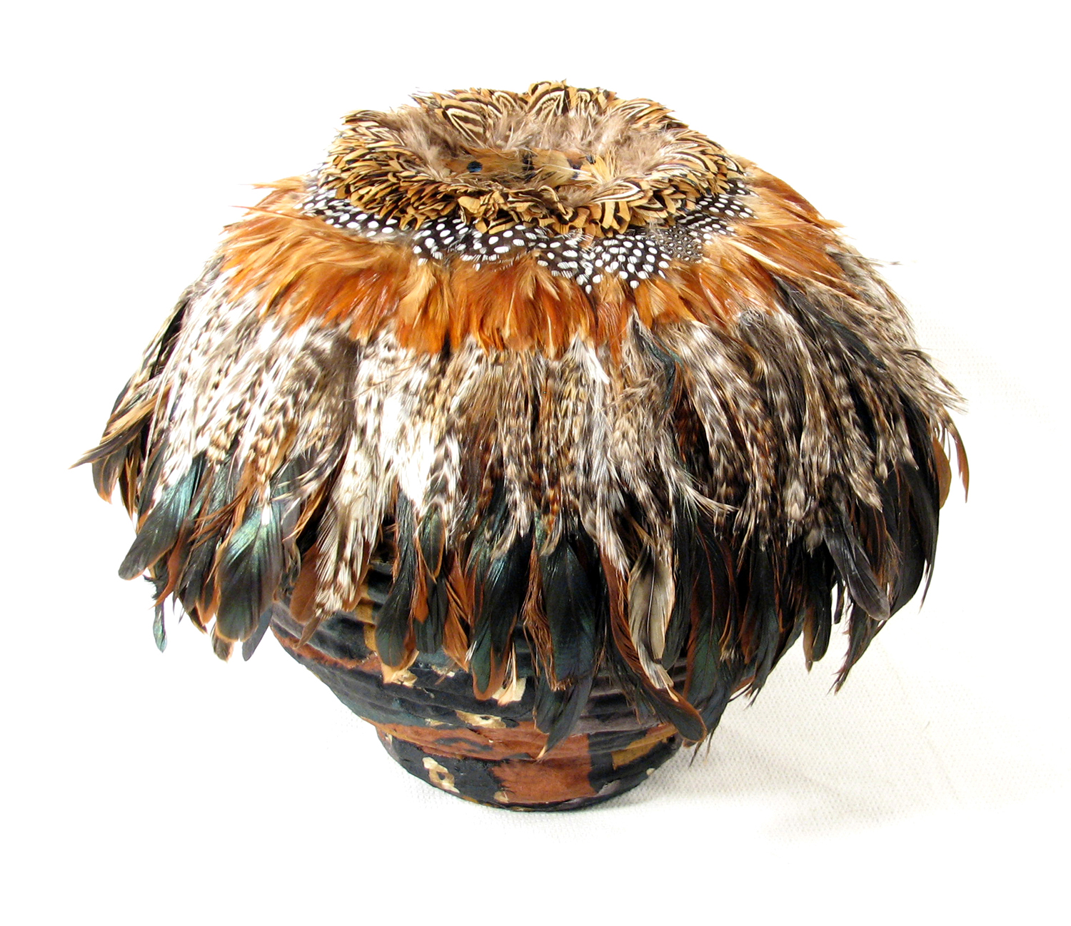 Fiber coiled basket with applied feathers