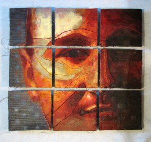 Mixed media fiber artwork…thread, yarn, acrylic paint, oil pastels, and colored pencil over a digital print.