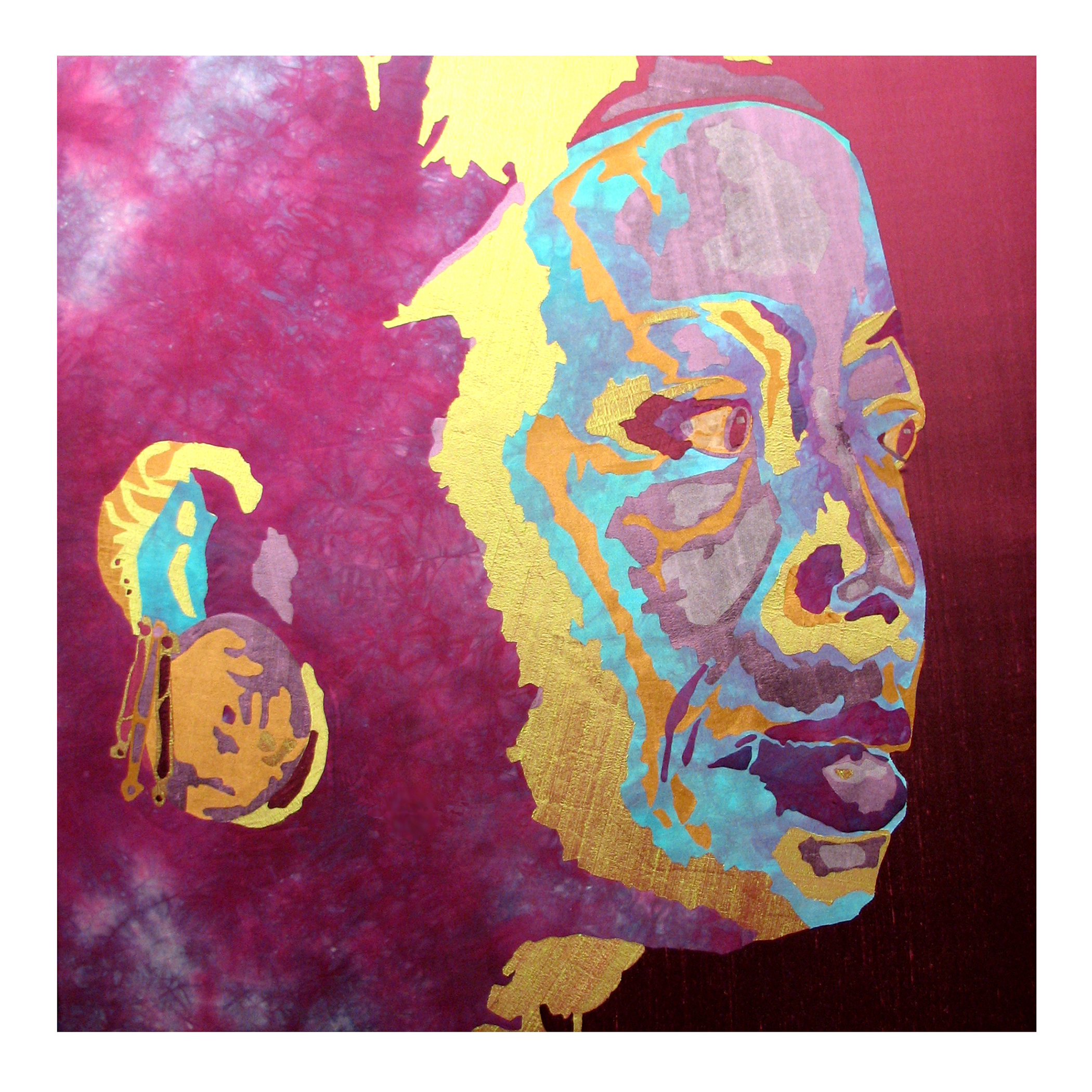 Fiber raw edged applique…portrait in blues, greens and purples. Hand dyed fabrics and dupioni silk