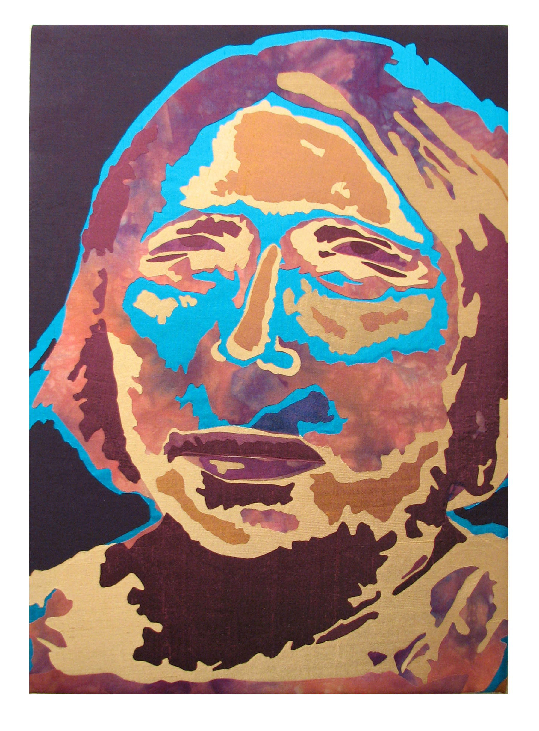 Fiber raw edged applique portrait using hand dyed cotton fabrics and dupioni silk.